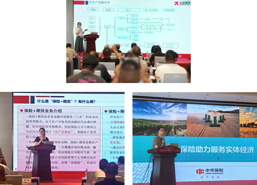 培训环节,三位行业专家进行了深度分享。正信期货农产品分析师张翠萍系统讲解了花生期货交易规则、交割标准及市场风险对冲策略,结合案例解析期货工具如何助力农户锁定收益。上海正信同创实业有限公司衍生品部戴霞详细阐述了"保险+期货"项目运作原理,分享了其主导的多个全国性项目经验,并介绍了襄州区花生项目的实施方案。中华财险湖北分公司苏晓强介绍了农业保险创新产品,提出"保险+期货+订单"的整合服务模式,旨在帮助农户实现从"保成本"向"保收入"的升级。
