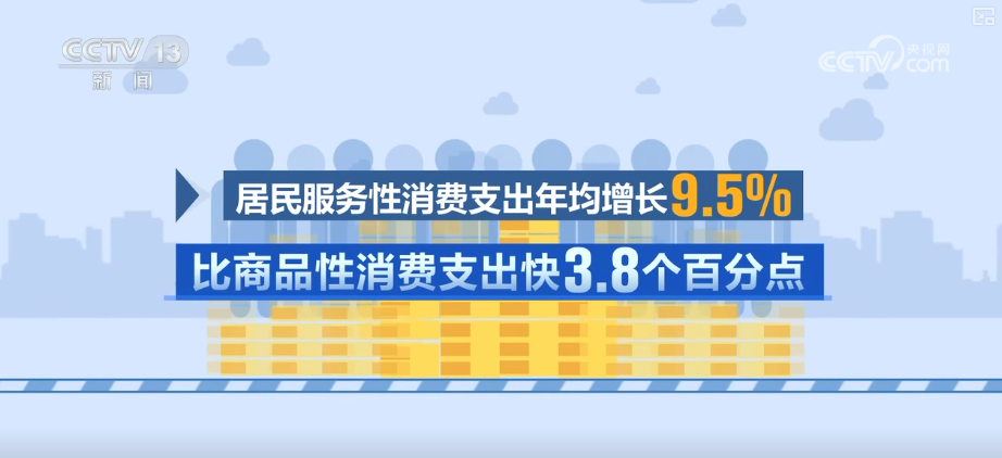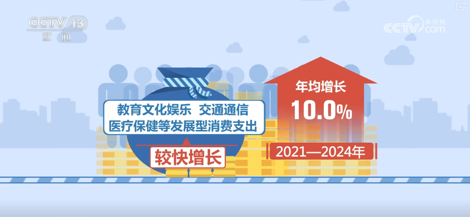 从支出看,教育文化娱乐、交通通信、医疗保健等发展型消费支出较快增长,2021—2024年年均增长10.0%;居民服务性消费支出年均增长9.5%,比商品性消费支出快3.8个百分点。