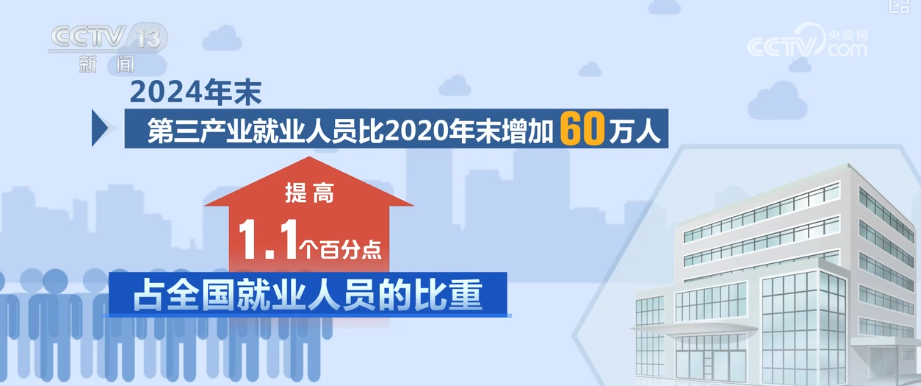 就业形势总体稳定,城镇就业人员继续增长。2024年末,全国城镇调查失业率均值为5.1%,比2020年下降0.5个百分点。第三产业吸纳就业能力增强。2024年末,第三产业就业人员比2020年末增加60万人,占全国就业人员的比重提高1.1个百分点,第三产业就业“蓄水池”作用更加凸显。