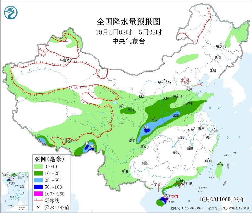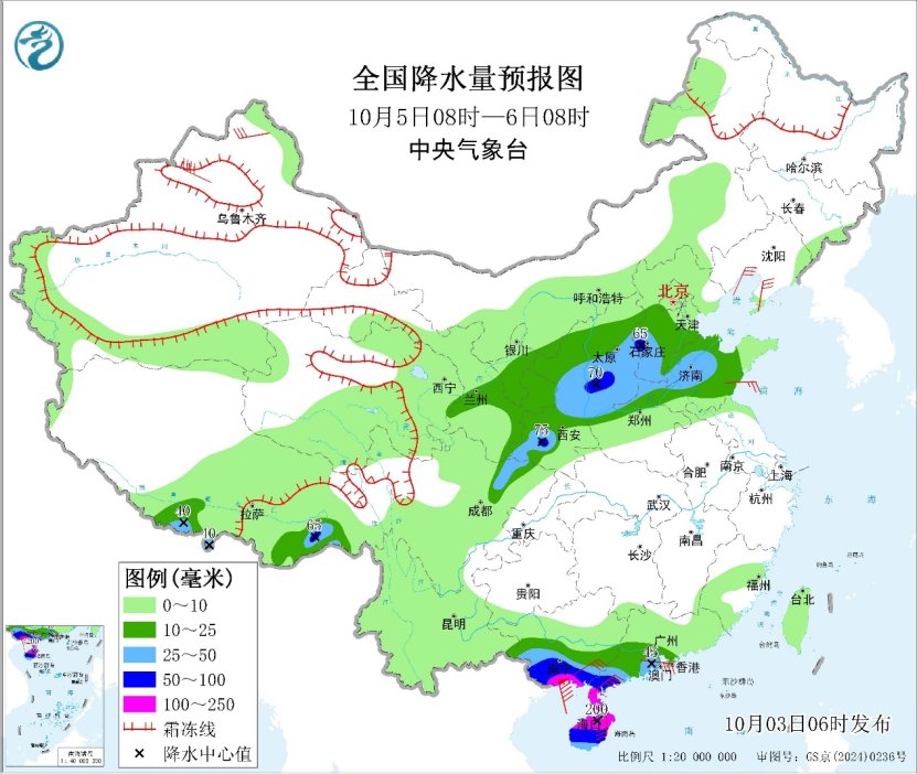 明后两天,雨带将持续北抬,甘肃东部、陕西、山西、京津冀等地将陆续出现降雨天气,部分地区累计降雨量较大,公众需关注天气变化,外出携带雨具,注意出行安全。另外,假期后半,北方冷空气较为活跃,受降雨和冷空气共同影响,华北、东北等地气温将明显下降,公众还需做好保暖措施。